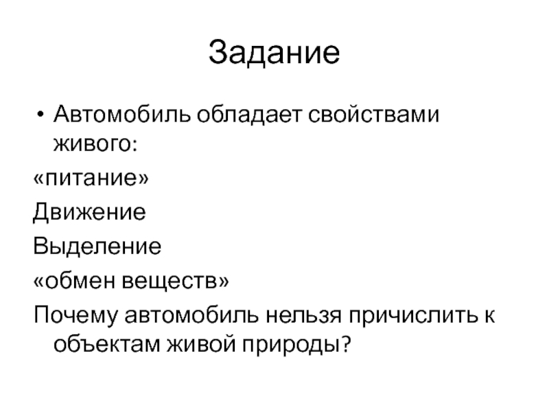 Задание Автомобиль обладает свойствами живого:«питание»ДвижениеВыделение «обмен веществ»Почему автомобиль нельзя причислить к объектам живой природы?