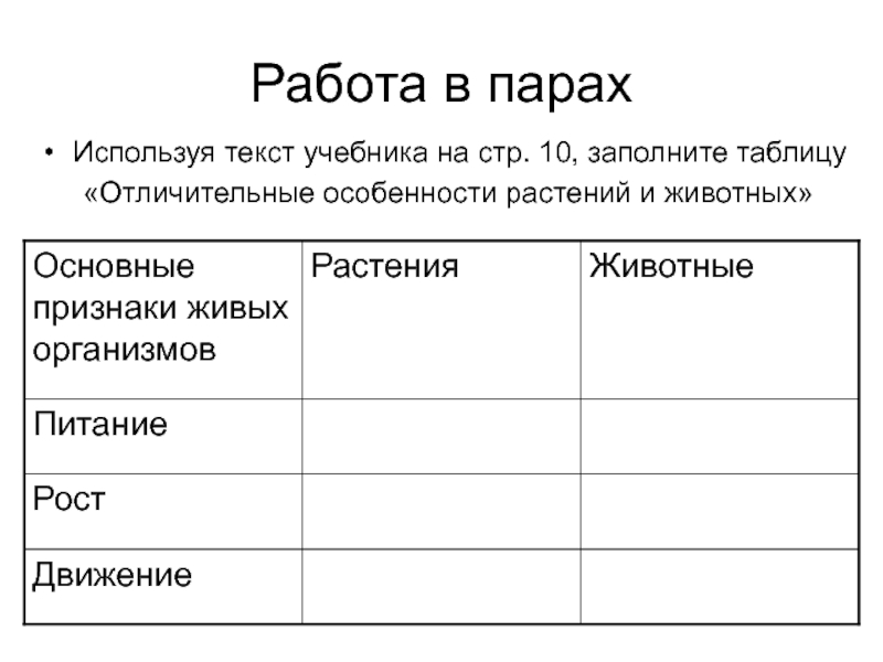 Работа в парахИспользуя текст учебника на стр. 10, заполните таблицу«Отличительные особенности растений и животных»
