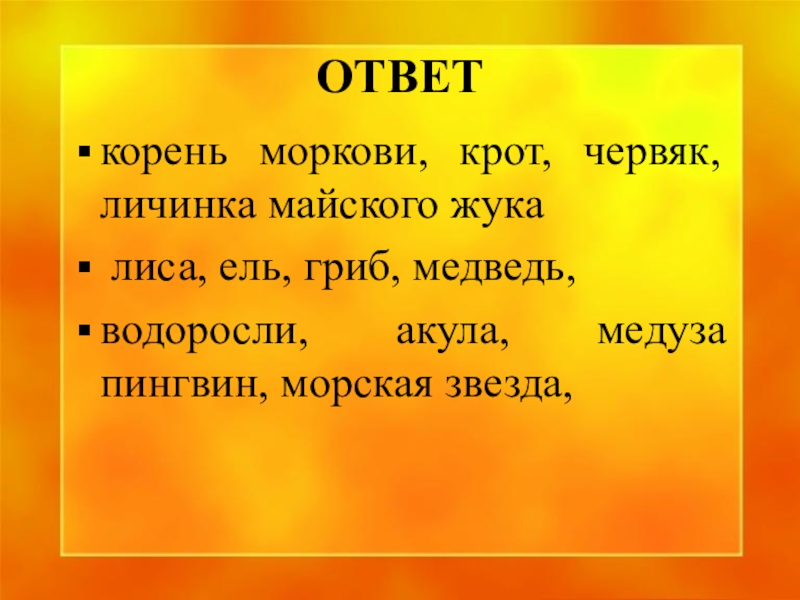 ОТВЕТкорень моркови, крот, червяк, личинка майского жука лиса, ель, гриб, медведь,водоросли, акула, медуза пингвин, морская звезда,