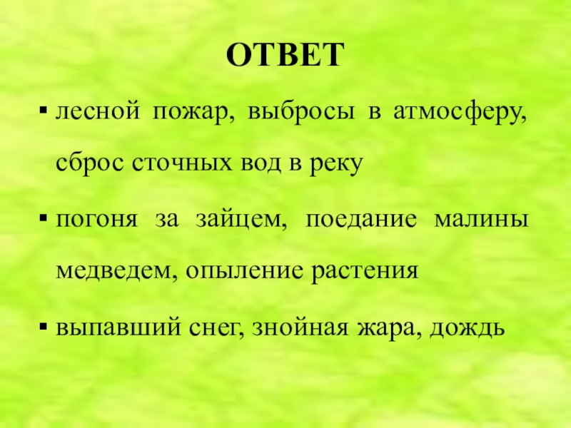 зайцем, выпавший снег, выбросы в атмосферу, поедание малины медведем, знойная жара, сброс сточных вод в реку, опыление растения, дождь