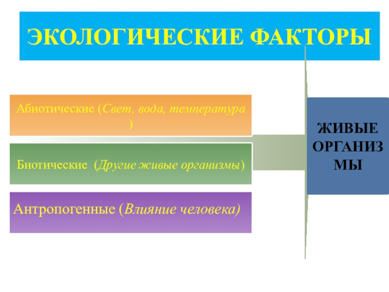 ЭКОЛОГИЧЕСКИЕ ФАКТОРЫАбиотические (Свет, вода, температура )Биотические (Другие живые организмы)Антропогенные (Влияние человека)ЖИВЫЕ ОРГАНИЗМЫ