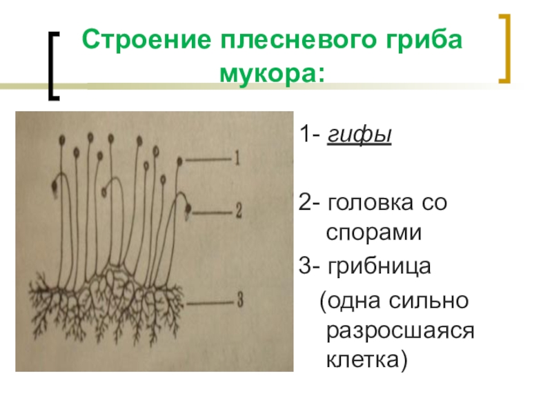 Строение плесневого гриба мукора: 1- гифы2- головка со спорами 3- грибница  (одна сильно разросшаяся клетка)