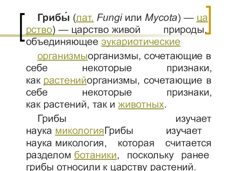 Грибы́ (лат. Fungi или Mycota) — царство) — царство живой природы, объединяющее эукариотические организмыорганизмы, сочетающие в себе некоторые признаки, как растенийорганизмы, сочетающие в себе некоторые признаки, как растений, так и животных. Грибы изучает наука микологияГрибы изучает наука микология, которая считается разделом ботаники, поскольку ранее грибы относили к царству растений.