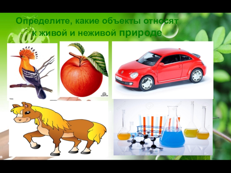 Слайд 2Определите, какие объекты относят к живой и неживой природе