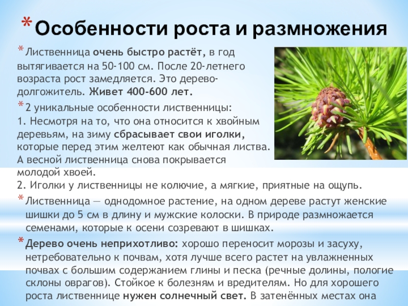 Особенности роста и размноженияЛиственница очень быстро растёт, в год вытягивается на 50-100 см. После 20-летнего возраста рост замедляется. Это