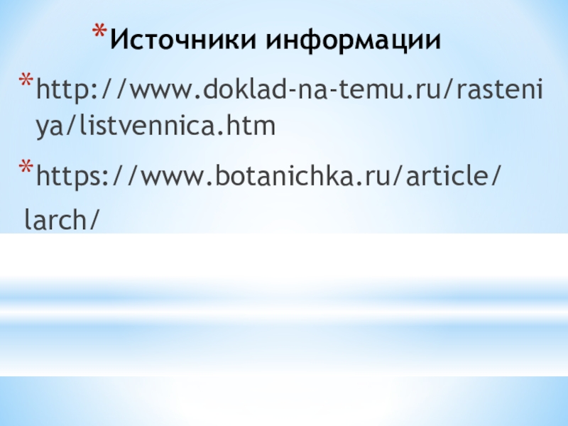 Источники информацииhttp://www.doklad-na-temu.ru/rasteniya/listvennica.htmhttps://www.botanichka.ru/article/larch/