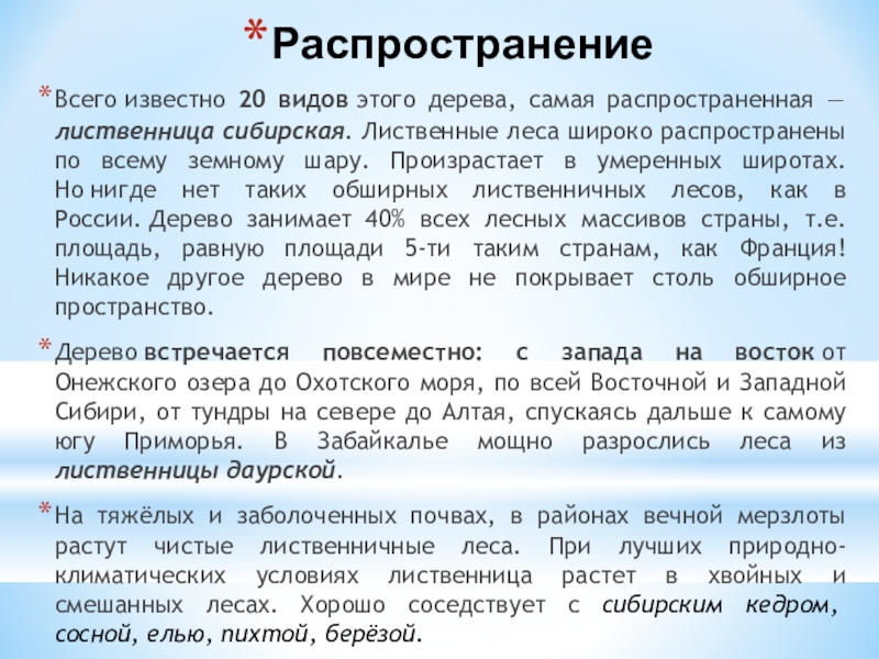РаспространениеВсего известно 20 видов этого дерева, самая распространенная — лиственница сибирская. Лиственные леса широко распространены по всему земному шару.