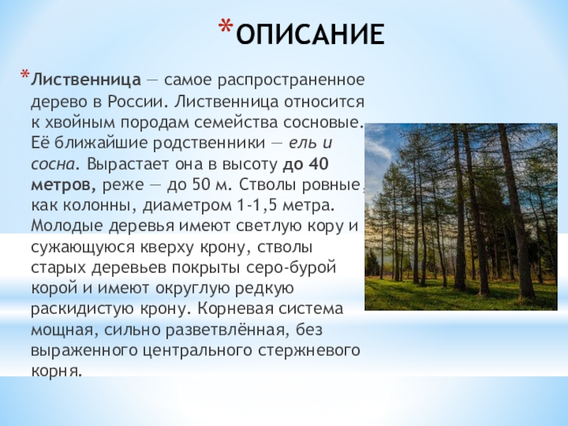 ОПИСАНИЕЛиственница — самое распространенное дерево в России. Лиственница относится к хвойным породам семейства сосновые. Её ближайшие родственники