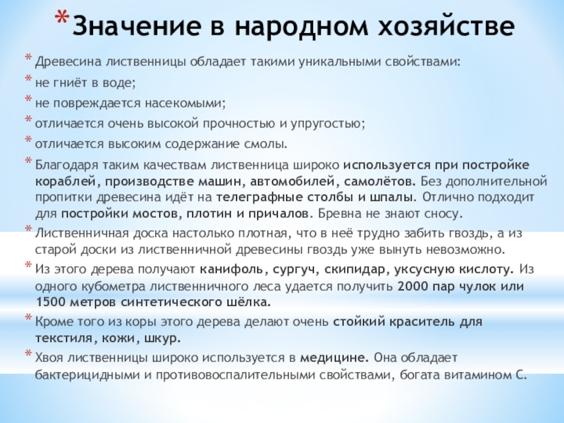 Значение в народном хозяйствеДревесина лиственницы обладает такими уникальными свойствами:не гниёт в воде;не повреждается насекомыми;отличается очень высокой прочностью и