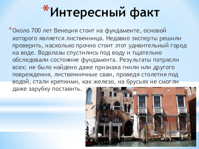 Интересный фактОколо 700 лет Венеция стоит на фундаменте, основой которого является лиственница. Недавно эксперты решили проверить, насколько прочно