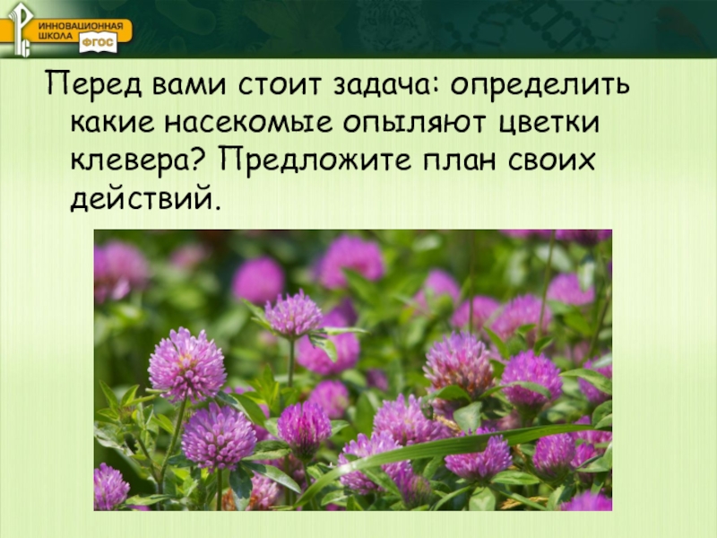Слайд 5Перед вами стоит задача: определить какие насекомые опыляют цветки клевера? Предложите