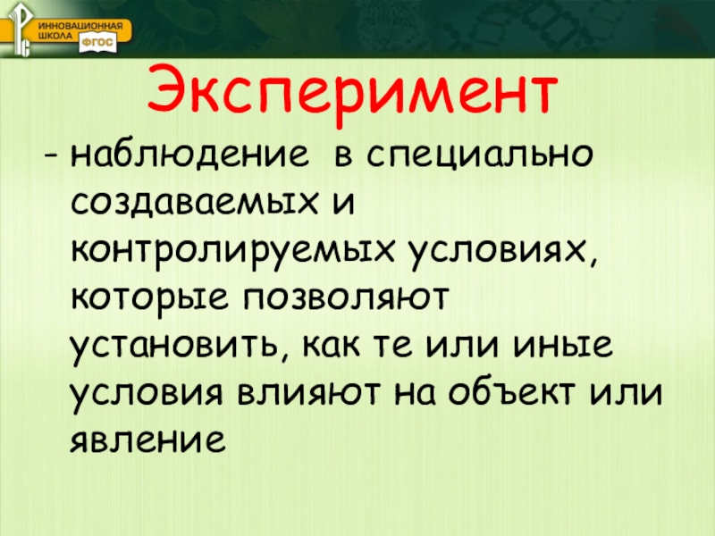 Эксперимент - наблюдение в специально создаваемых и контролируемых условиях, которые позволяют установить, как те или иные условия