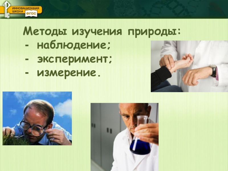 Методы изучения природы:наблюдение;эксперимент;измерение.