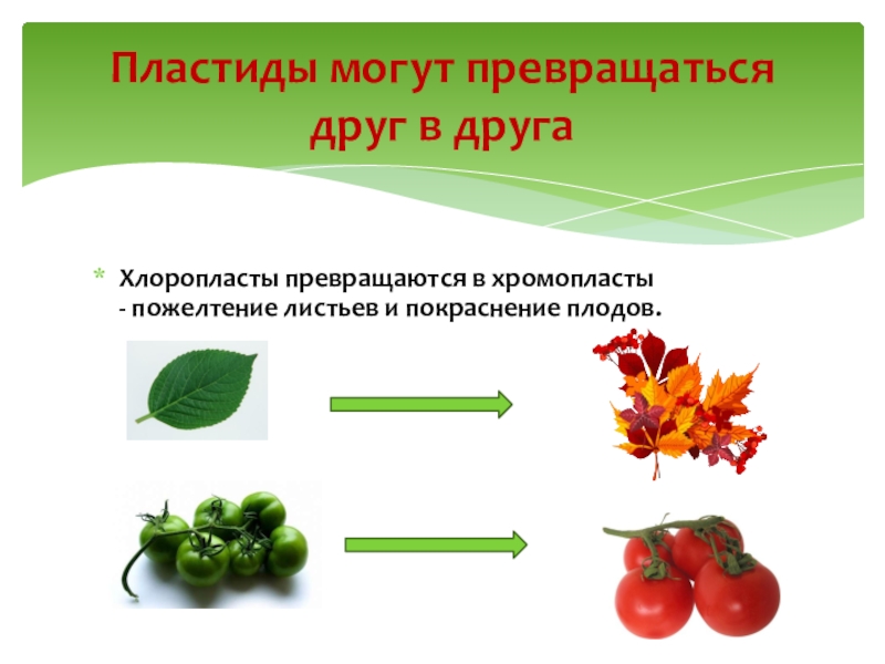 Хлоропласты превращаются в хромопласты - пожелтение листьев и покраснение плодов.  Пластиды могут превращаться  друг в друга