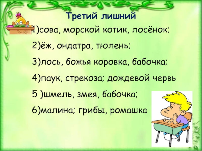 Третий лишний1)сова, морской котик, лосёнок;2)ёж, ондатра, тюлень; 3)лось, божья коровка, бабочка;4)паук, стрекоза; дождевой червь5 )шмель, змея, бабочка;6)малина;