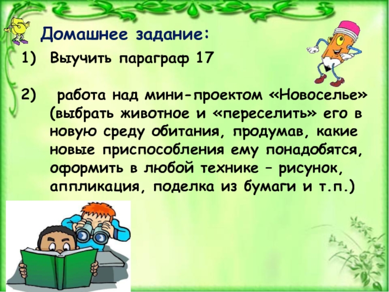 Домашнее задание:Выучить параграф 17 работа над мини-проектом «Новоселье» (выбрать животное и «переселить» его в новую среду обитания, продумав,