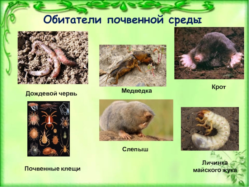 Обитатели почвенной средыДождевой червьМедведкаСлепышПочвенные клещиКротЛичинка майского жука