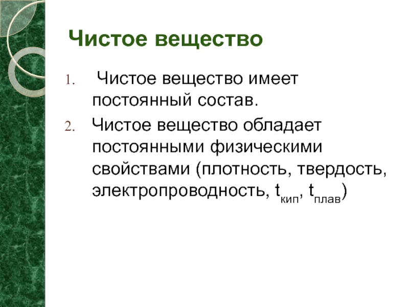Чистое вещество Чистое вещество имеет постоянный состав.Чистое вещество обладает постоянными физическими свойствами (плотность, твердость, электропроводность, tкип, tплав)