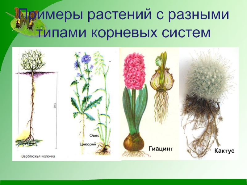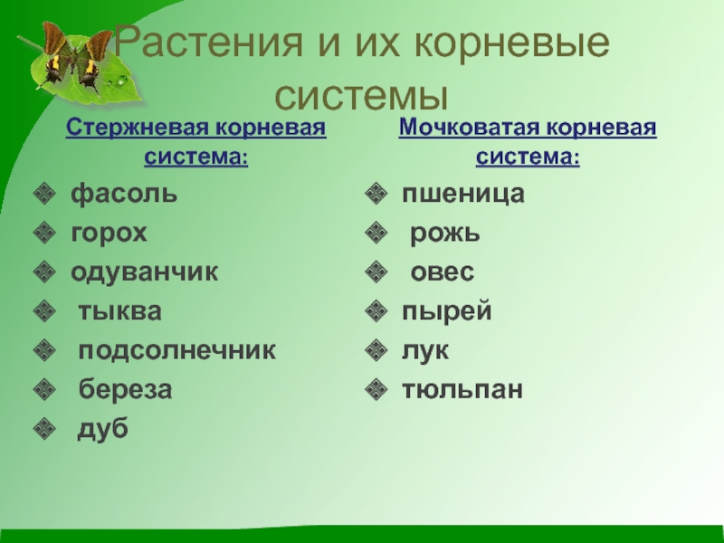 Мочковатая корневая система характерна для однодольных растений, например пшеницы, ячменя, лука, чеснока и др.