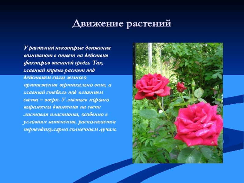 на действия факторов внешней среды. Так, главный корень растет под действием силы земного притяжения вертикально вниз, а главный стебель под влиянием света – вверх. У листьев хорошо выражены движения на свет: листовая пластинка, особенно в условиях затенения, располагается перпендикулярно солнечным лучам.
