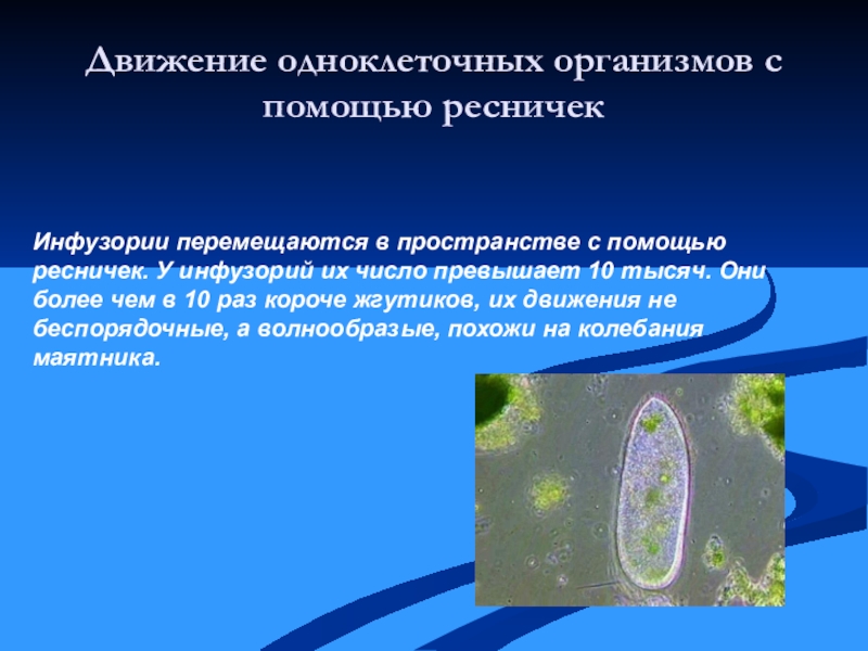 ресничек. У инфузорий их число превышает 10 тысяч. Они более чем в 10 раз короче жгутиков, их движения не беспорядочные, а волнообразые, похожи на колебания маятника.