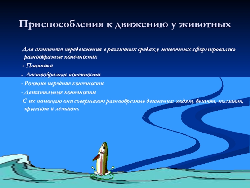 - Для активного передвижения в различных средах у животных сформировались разнообразные конечности ( плавники, ластообразные конечности, роющие передние конечности, специальные двигательные конечности ).
