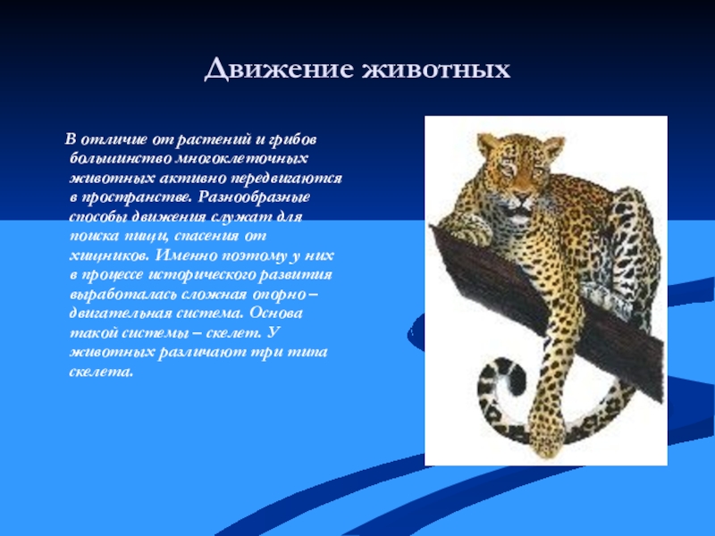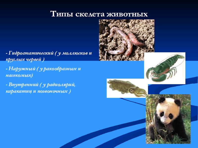 многоклеточных животных активно передвигаются в пространстве. Разнообразные способы движения служат для поиска пищи, спасения от хищников. Именно поэтому у них в процессе исторического развития выработалась сложная опорно – двигательная система. Основа такой системы – скелет. У животных различают три типа скелета.