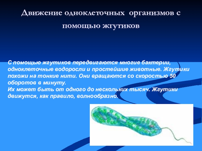 бактерии, одноклеточные водоросли и простейшие животные. Жгутики похожи на тонкие нити. Они вращаются со скоростью 50 оборотов в минуту.