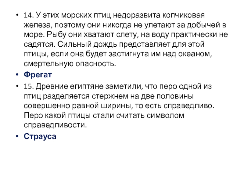 14. У этих морских птиц недоразвита копчиковая железа, поэтому они никогда