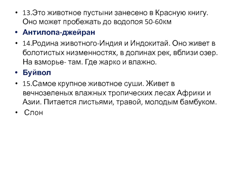15.Самое крупное животное суши. Живет в вечнозеленых влажных тропических лесах Африки и Азии. Питается листьями, травой, молодым бамбуком.