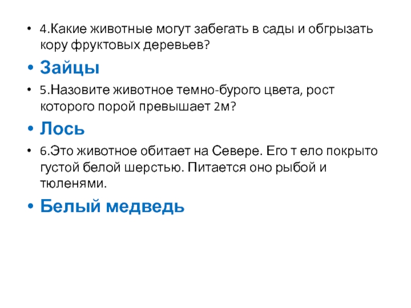 6.Это животное обитает на Севере. Его т ело покрыто густой белой шерстью. Питается оно рыбой и тюленями.