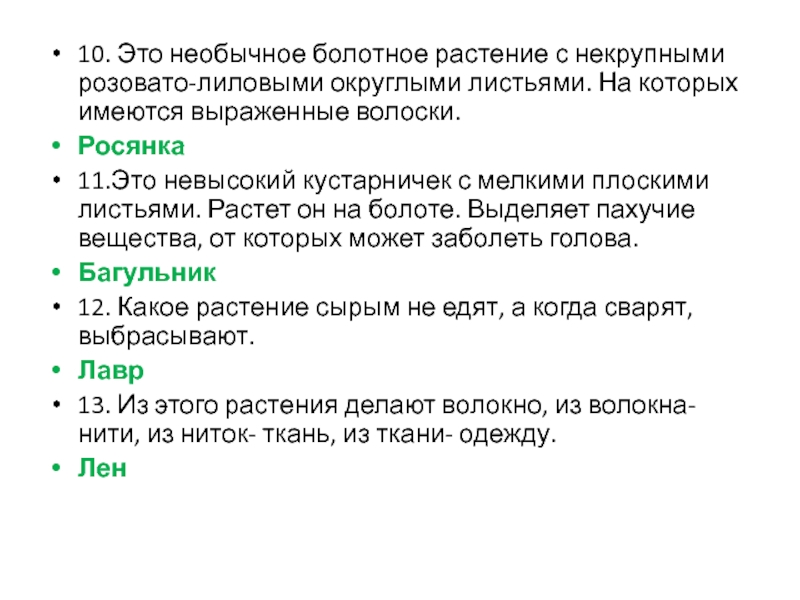 11.Это невысокий кустарничек с мелкими плоскими листьями. Растет он на болоте. Выделяет пахучие вещества, от которых может заболеть голова.