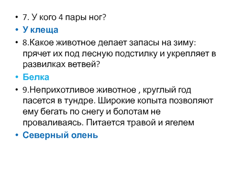 9.Неприхотливое животное , круглый год пасется в тундре. Широкие копыта позволяют ему бегать по снегу и болотам не проваливаясь. Питается травой и ягелем
