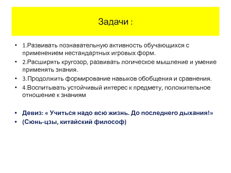 1.Развивать познавательную активность обучающихся с применением нестандартных игровых форм.