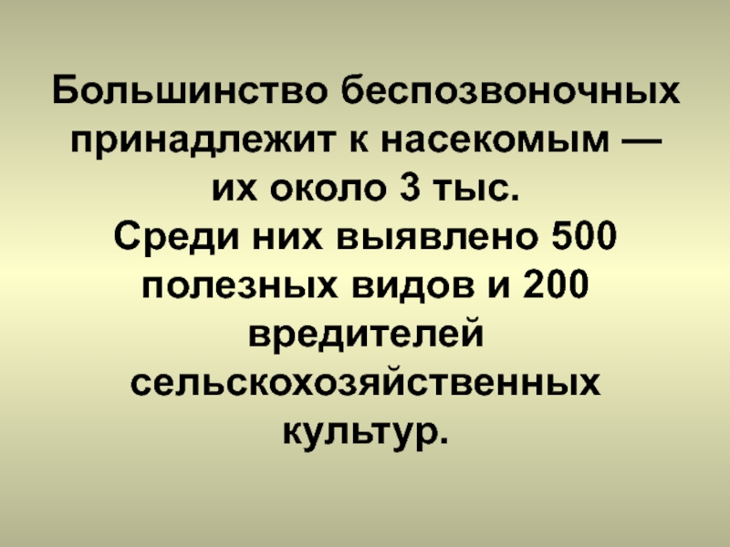 Слайд 25Большинство беспозвоночных принадлежит к насекомым — их около 3 тыс. Среди них