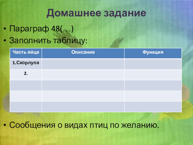 Домашнее заданиеПараграф 48(…)Заполнить таблицу:Сообщения о видах птиц по желанию.