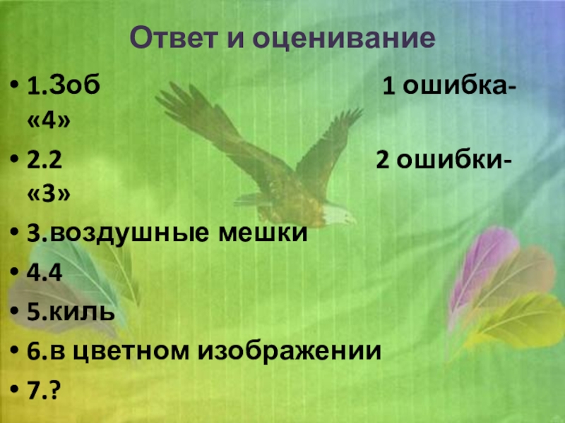 Тест1.Расширение пищевода у многих птиц…2.Сколько отделов имеет желудок птиц?3.Между внутренними органами и мышцами располагаются…4.Сколько камер имеет сердце?5.Грудина имеет вырост…6.В каком цвете птицы видят окружающее?7.Сколько подскорлуповых оболочек?