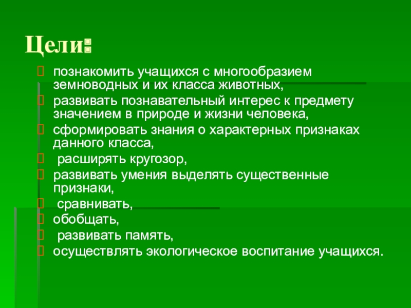 Цели:познакомить учащихся с многообразием земноводных и их класса животных, развивать познавательный интерес к предмету значением в природе и жизни человека, сформировать знания о характерных признаках данного класса, расширять кругозор, развивать умения выделять существенные признаки, сравнивать, обобщать,