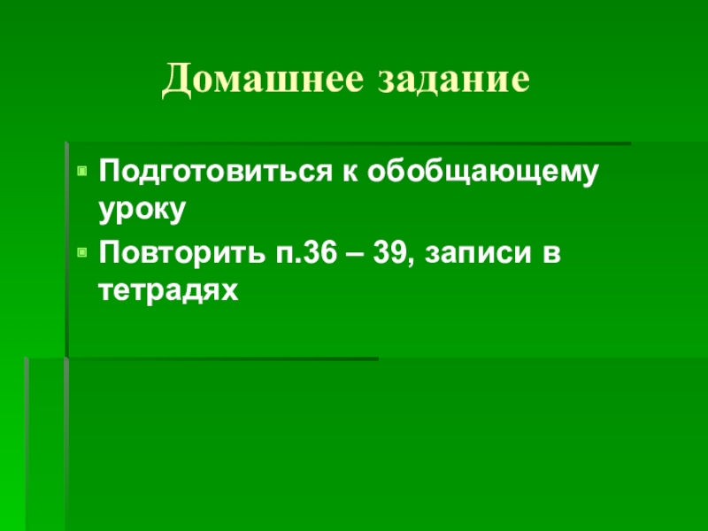 Домашнее заданиеПодготовиться к обобщающему урокуПовторить п.36 – 39, записи в тетрадях