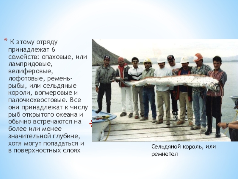 лофотовые, ремень-рыбы, или сельдяные короли, вогмеровые и палочкохвостовые. Все они принадлежат к числу рыб открытого океана и обычно встречаются на более или менее значительной глубине, хотя могут попадаться и в поверхностных слоях