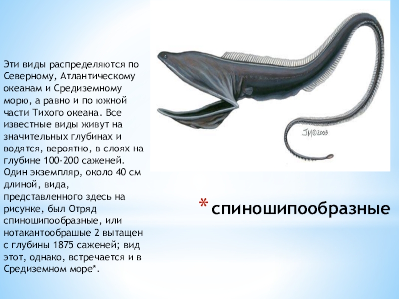 равно и по южной части Тихого океана. Все известные виды живут на значительных глубинах и водятся, вероятно, в слоях на глубине 100-200 саженей. Один экземпляр, около 40 см длиной, вида, представленного здесь на рисунке, был Отряд спиношипообразные, или нотакантообрашые 2 вытащен с глубины 1875 саженей; вид этот, однако, встречается и в Средиземном море*.