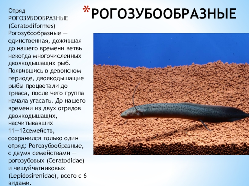 Отряд РОГОЗУБООБРАЗНЫЕ (Ceratodiformes)Рогозубообразные — единственная, дожившая до нашего времени ветвь некогда