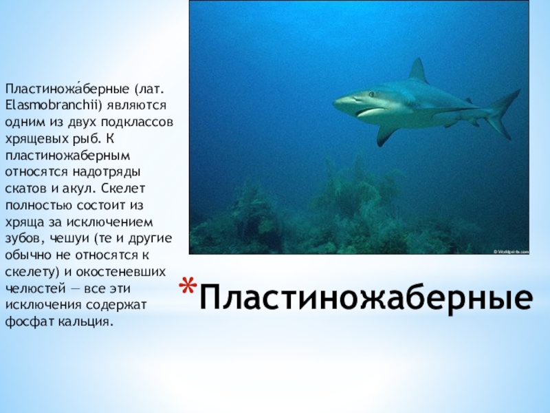пластиножаберным относятся надотряды скатов и акул. Скелет полностью состоит из хряща за исключением зубов, чешуи (те и другие обычно не относятся к скелету) и окостеневших челюстей — все эти исключения содержат фосфат кальция.