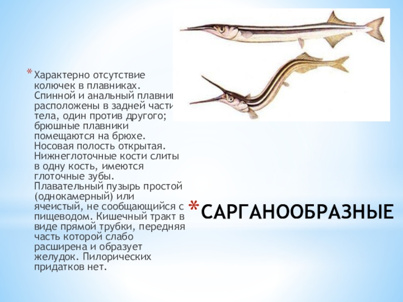 задней части тела, один против другого; брюшные плавники помещаются на брюхе. Носовая полость открытая. Нижнеглоточные кости слиты в одну кость, имеются глоточные зубы. Плавательный пузырь простой (однокамерный) или ячеистый, не сообщающийся с пищеводом. Кишечный тракт в виде прямой трубки, передняя часть которой слабо расширена и образует желудок. Пилорических придатков нет.
