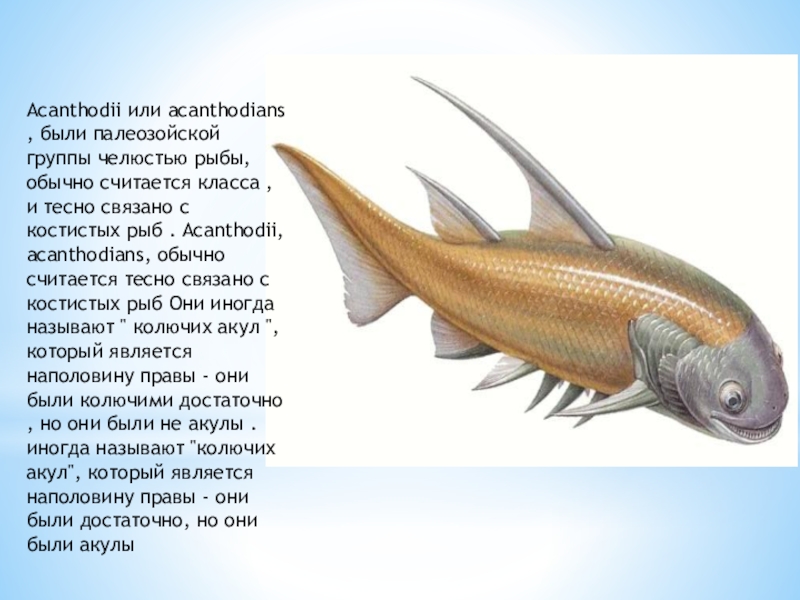 класса , и тесно связано с костистых рыб . Acanthodii, acanthodians, обычно считается тесно связано с костистых рыб Они иногда называют " колючих акул ", который является наполовину правы - они были колючими достаточно , но они были не акулы . иногда называют "колючих акул", который является наполовину правы - они были достаточно, но они были акулы