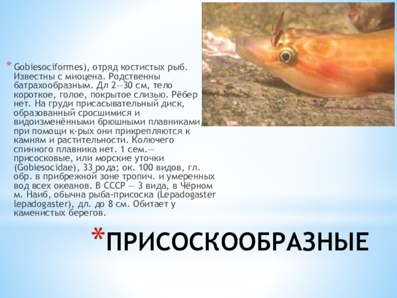 см, тело короткое, голое, покрытое слизью. Рёбер нет. На груди присасывательный диск, образованный сросшимися и видоизменёнными брюшными плавниками, при помощи к-рых они прикрепляются к камням и растительности. Колючего спинного плавника нет. 1 сем.— присосковые, или морские уточки (Gobiesocidae), 33 рода; ок. 100 видов, гл. обр. в прибрежной зоне тропич. и умеренных вод всех океанов. В СССР — 3 вида, в Чёрном м. Наиб, обычна рыба-присоска (Lepadogaster lepadogaster), дл. до 8 см. Обитает у каменистых берегов.