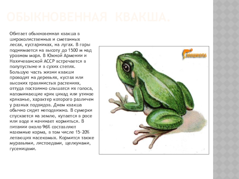 Обыкновенная квакша.Обитает обыкновенная квакша в широколиственных и сметанных лесах, кустарниках, на лугах. В горы поднимается на высоту