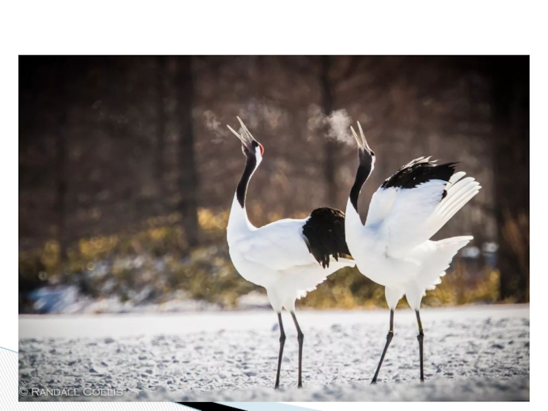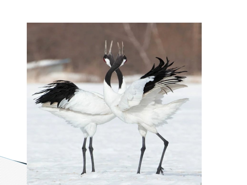 Слайд 7Ещё одна примечательная особенность журавлей – танцы. Репертуар танцев составляют прыжки,