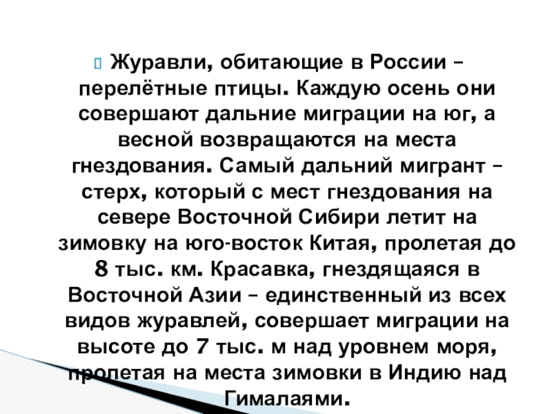 Слайд 15Журавли, обитающие в России – перелётные птицы. Каждую осень они совершают