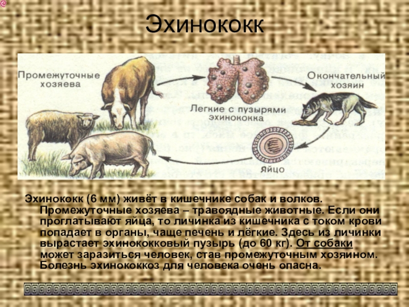 Эхинококк (6 мм) живёт в кишечнике собак и волков. Промежуточные хозяева